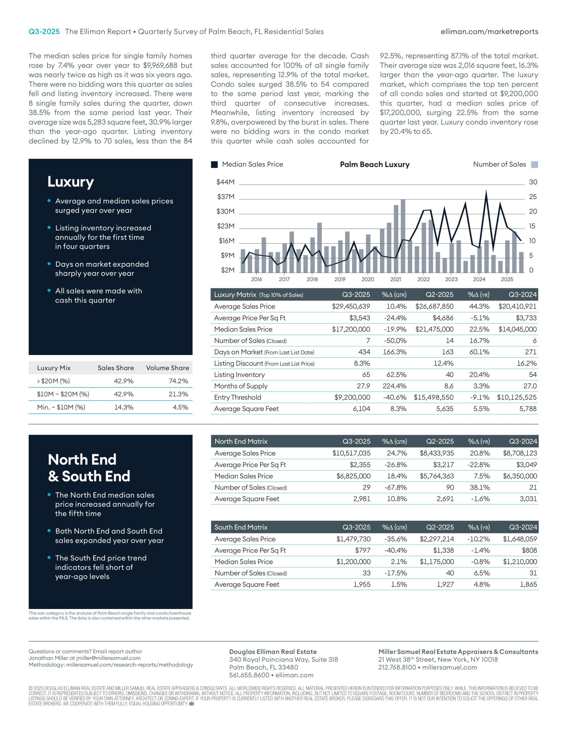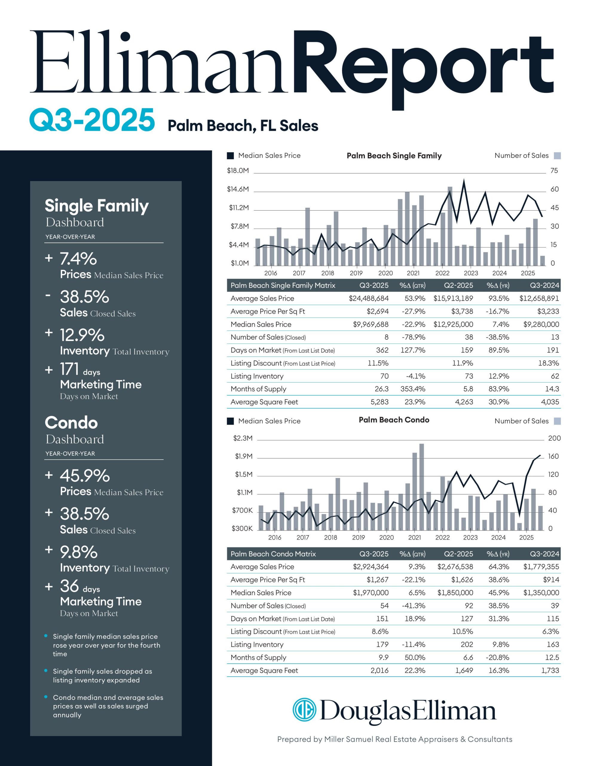 Most of the Florida housing markets monitored by Douglas Elliman are beginning to see more sales growth and a lower rate of listing inventory gains, with a few markets experiencing declines. With more inventory available, the market share of bidding wars has begun to normalize. Cash sales remain an important tool to enable demand and tend to be more prevalent at higher price points across the region. Housing prices showed mixed annual results, with larger gains more apparent in the luxury market.